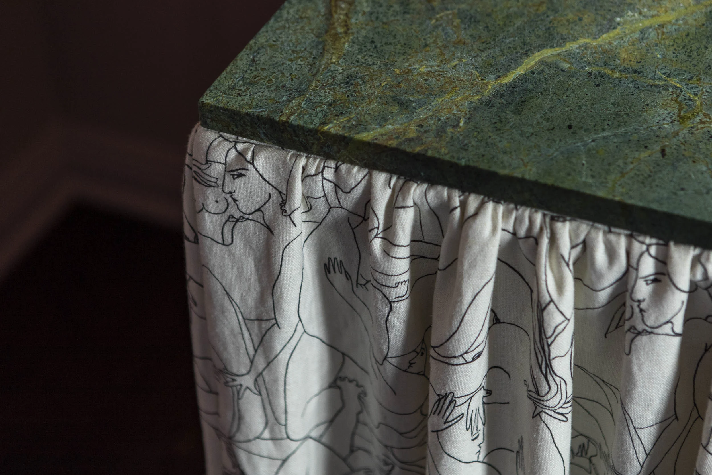 "SWATHES OF TERRA-COTTA, YELLOW, GREEN, AND BLUE, STRATEGICALLY SET AGAINST A KALEIDOSCOPIC ARRAY OF FABRICS AND WALLPAPERS"